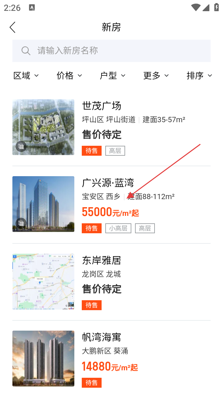 2、在新房页面,可通过搜索框输入新房名称查找,找到心仪楼盘,比如世茂广场、广兴源·蓝湾等。