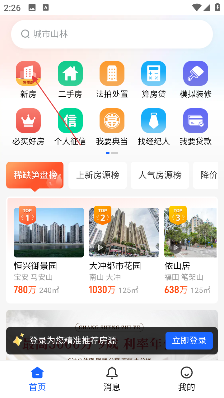 1、打开长昇置业,首页有新房、二手房等功能入口,若要找新房,点击【新房】进入新房页面。