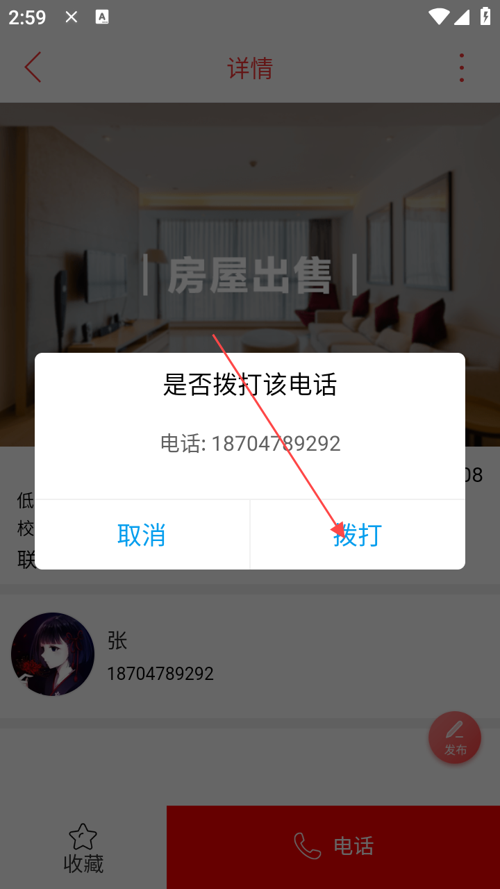 3、在详情页,点底部【电话】,弹出确认拨打弹窗。