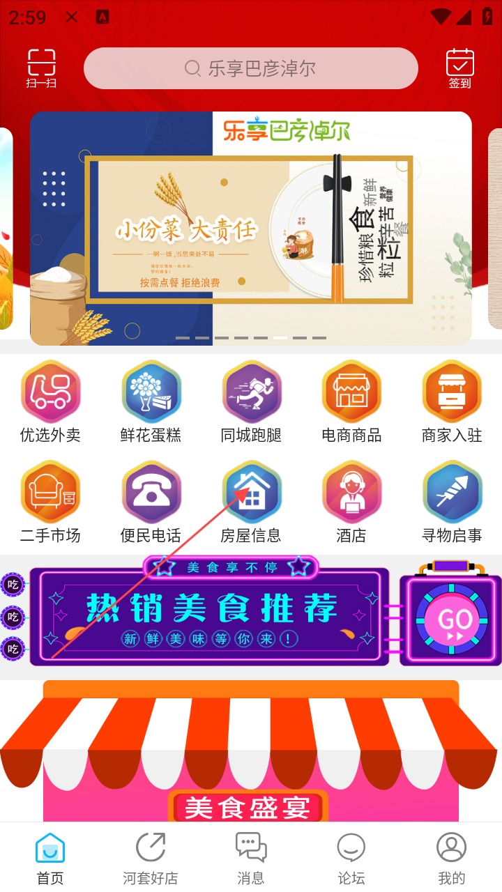 1、打开乐享巴彦淖尔,在首页点【房屋信息】,进房屋信息列表页。