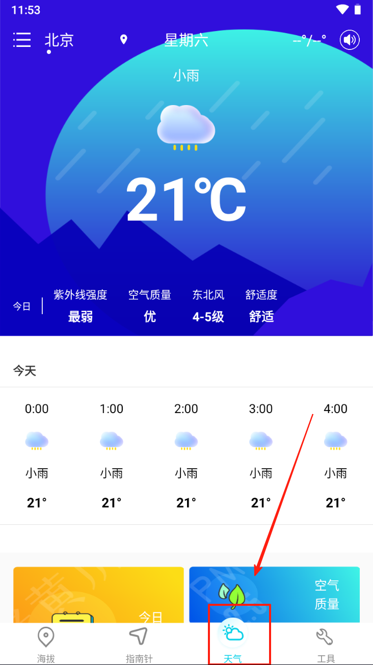 3、然后,点击“天气”图标,查看当前的天气状况和空气质量。