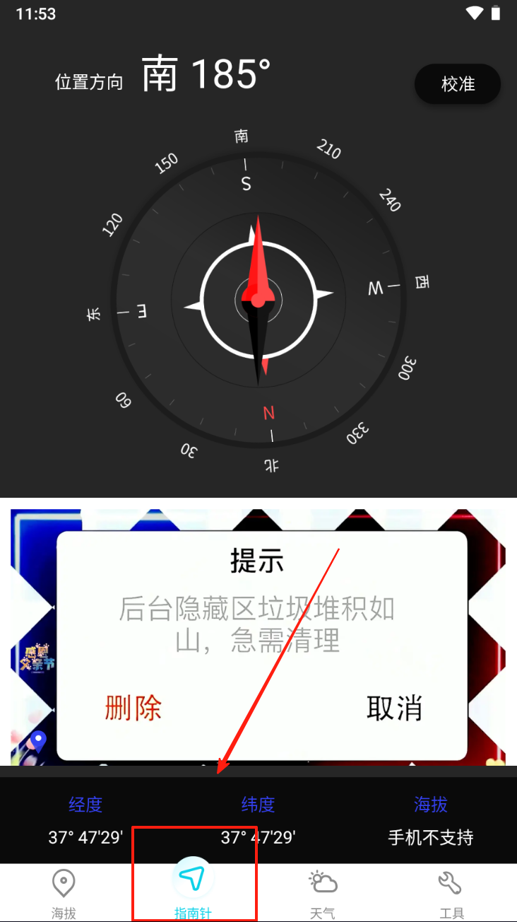 2、接着,点击“指南针”图标,获取当前的方位角度和地理坐标。