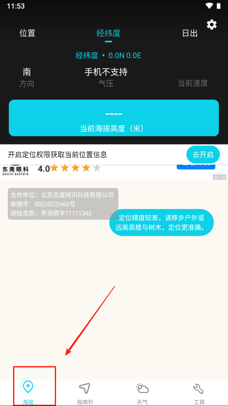 1、首先,点击“海拔”图标,查看当前位置的海拔高度和方向。