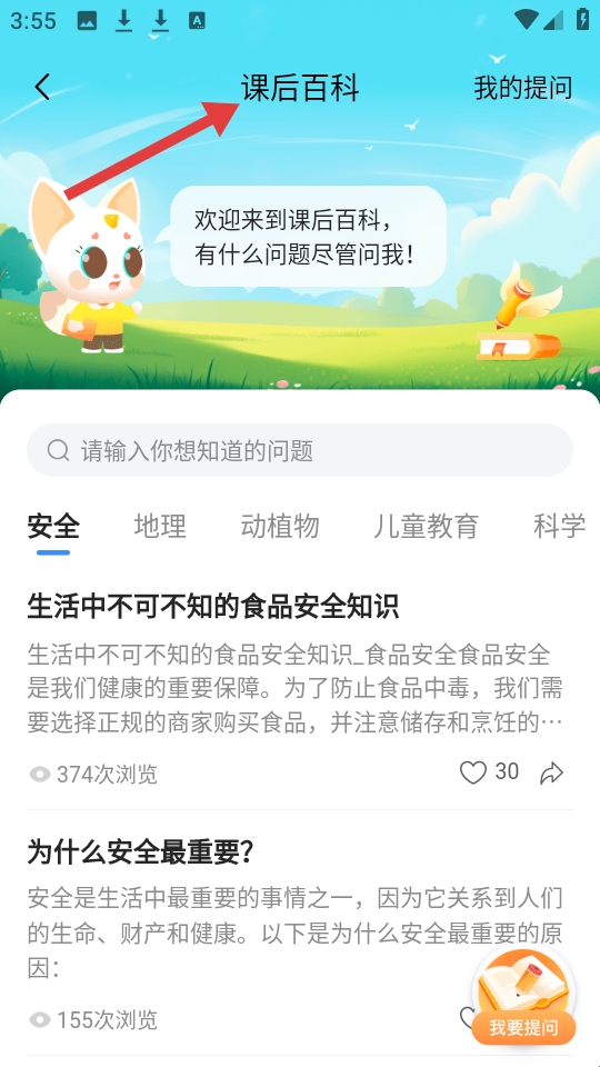 3、该页面是APP的课后百科板块,有可爱卡通形象引导提问,展示安全地理等多领域知识文章还支持用户自行提问。