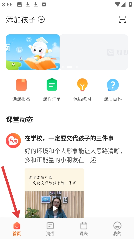 1、教育类APP首页可添加孩子,页面有选课报名等功能区,课堂动态展示教育相关内容底部有首页等导航栏。