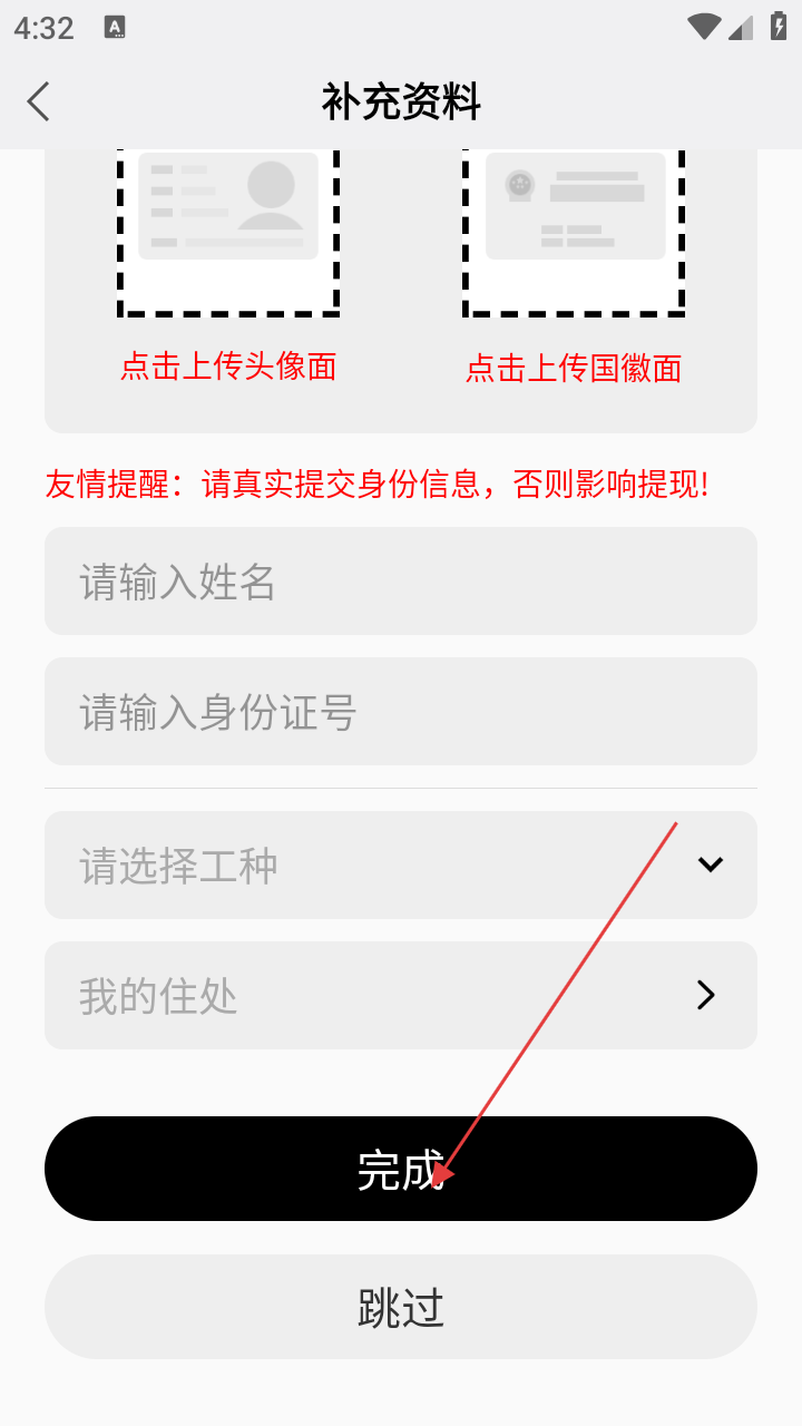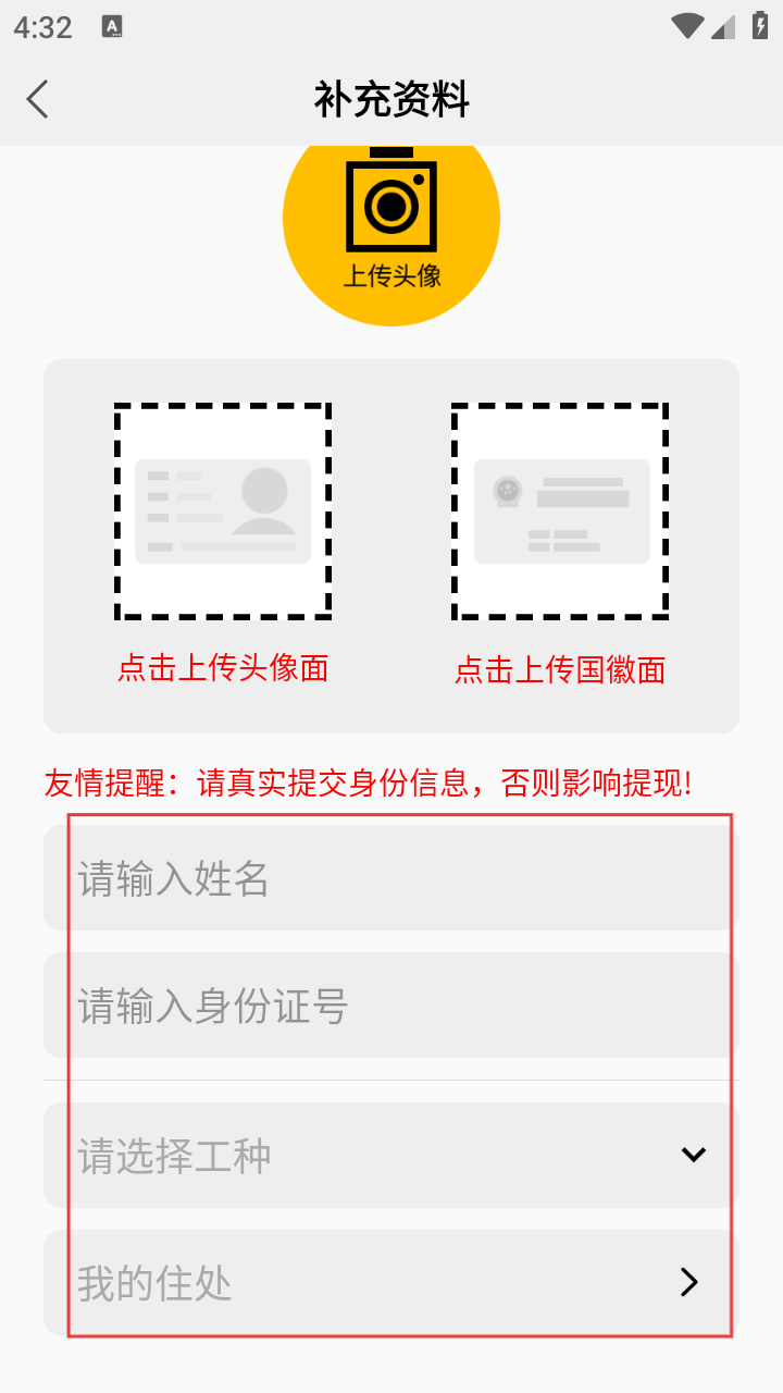 3、选好身份进入补充资料页,要上传头像、身份证头像面和国徽面,还得输入姓名、身份证号,选择工种和填写住处。