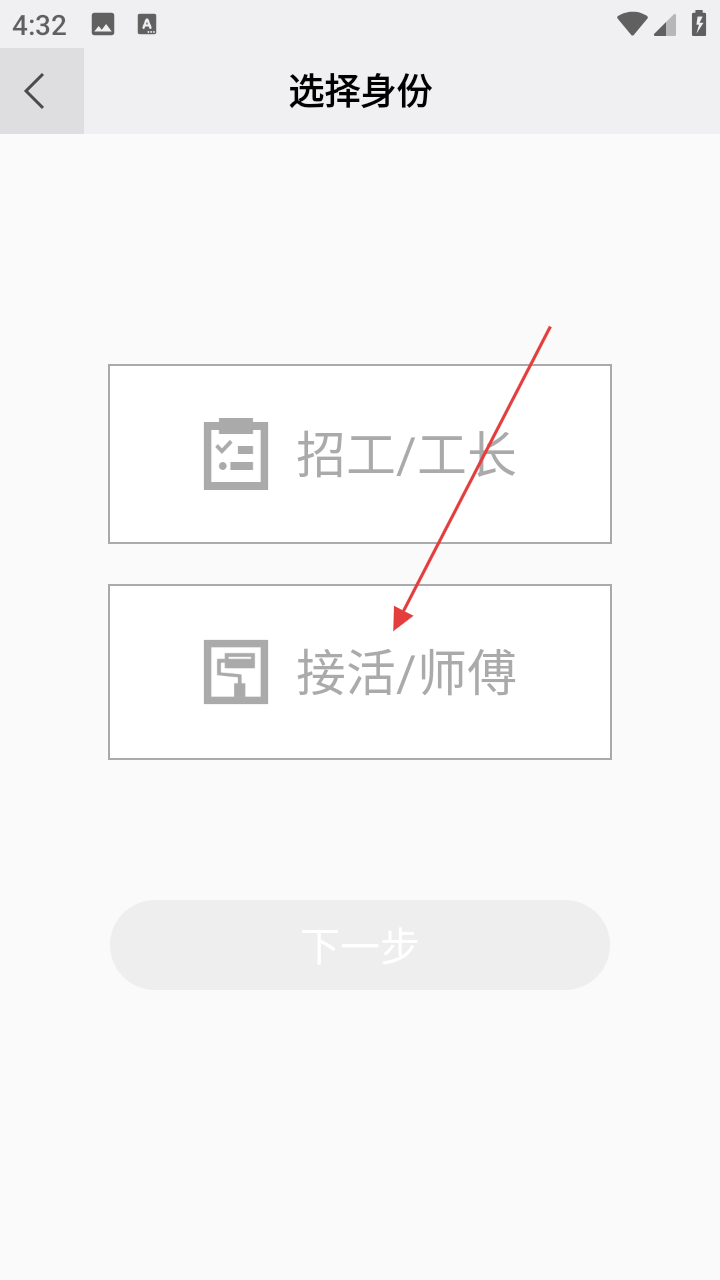 2、登录后到选择身份页面,这里有【招工/工长】和【接活/师傅】选项,选【接活/师傅】,为后续接活做准备。