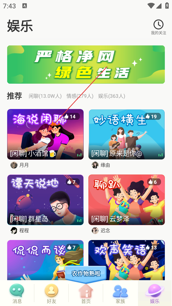 2、进入娱乐页面后,可看到推荐的各类闲聊房间,选择感兴趣的房间进入。