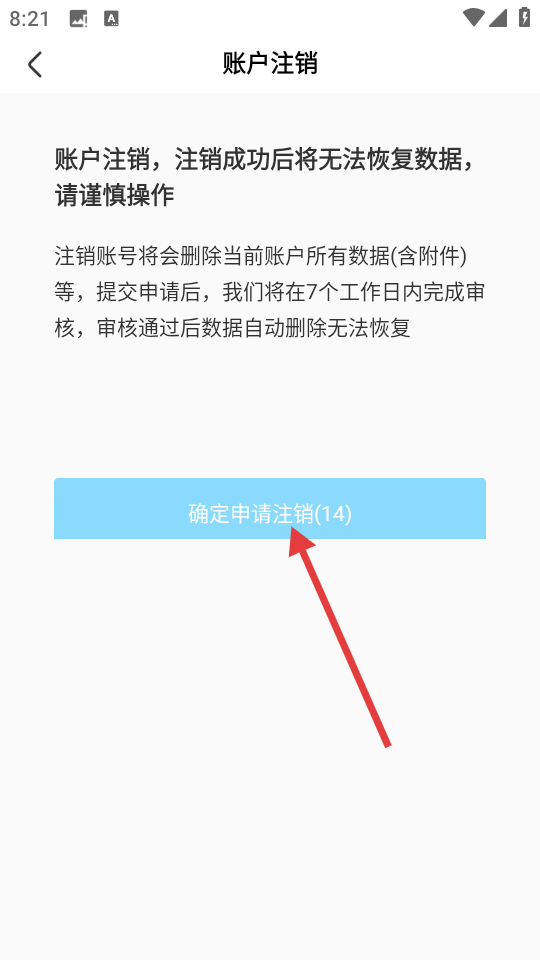 4、在账户注销说明页面,点击【确定申请注销】按钮,提交账号注销申请,随后等待审核完成就可以了。