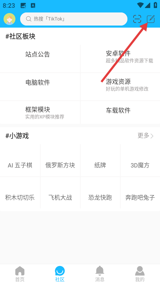 2、在社区界面,点击右上角编辑图标,进入板块选择页面。