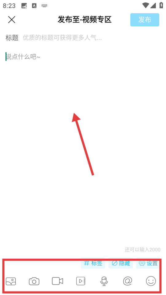 4、在发布编辑页,填写标题和内容,可使用图片等工具辅助创作,完成后点击【发布】,即可将内容发布至视频专区。