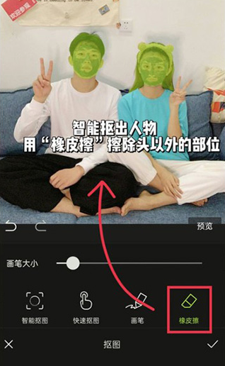 2、使用智能抠图,一键抠出人物,用“橡皮擦”擦除头部以内的部位。