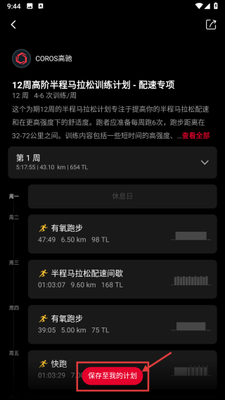 4、在计划详情页,点击保存至我的计划按钮,完成训练计划保存操作。