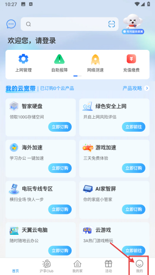 1、打开电信云宽带首页,点击底部我的选项,进入个人中心页面。