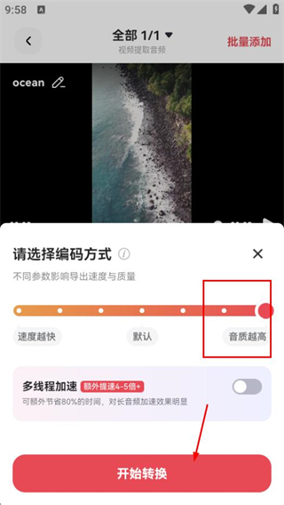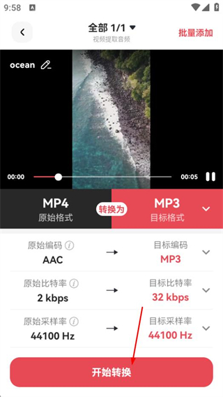 4、在该页面,选择编码方式后再次点击开始转换,即可开始提取视频中的音频。