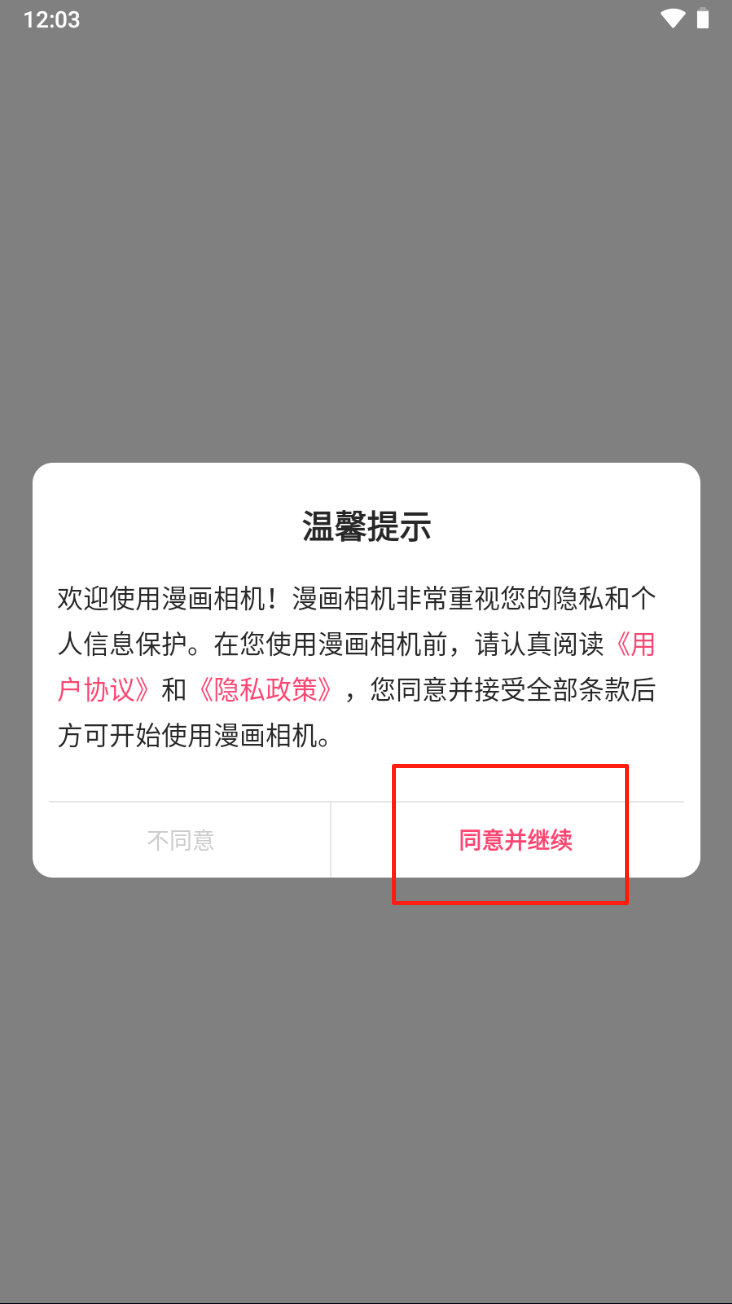 1、首先,同意应用的用户协议和隐私政策。点击“同意并继续”按钮以接受条款。