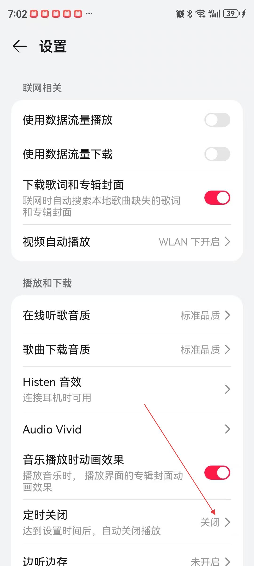 4、在设置界面中,找到【定时关闭】选项,点击进入可设置自动关闭播放的时间,以便在指定时间后自动停止音乐播放。