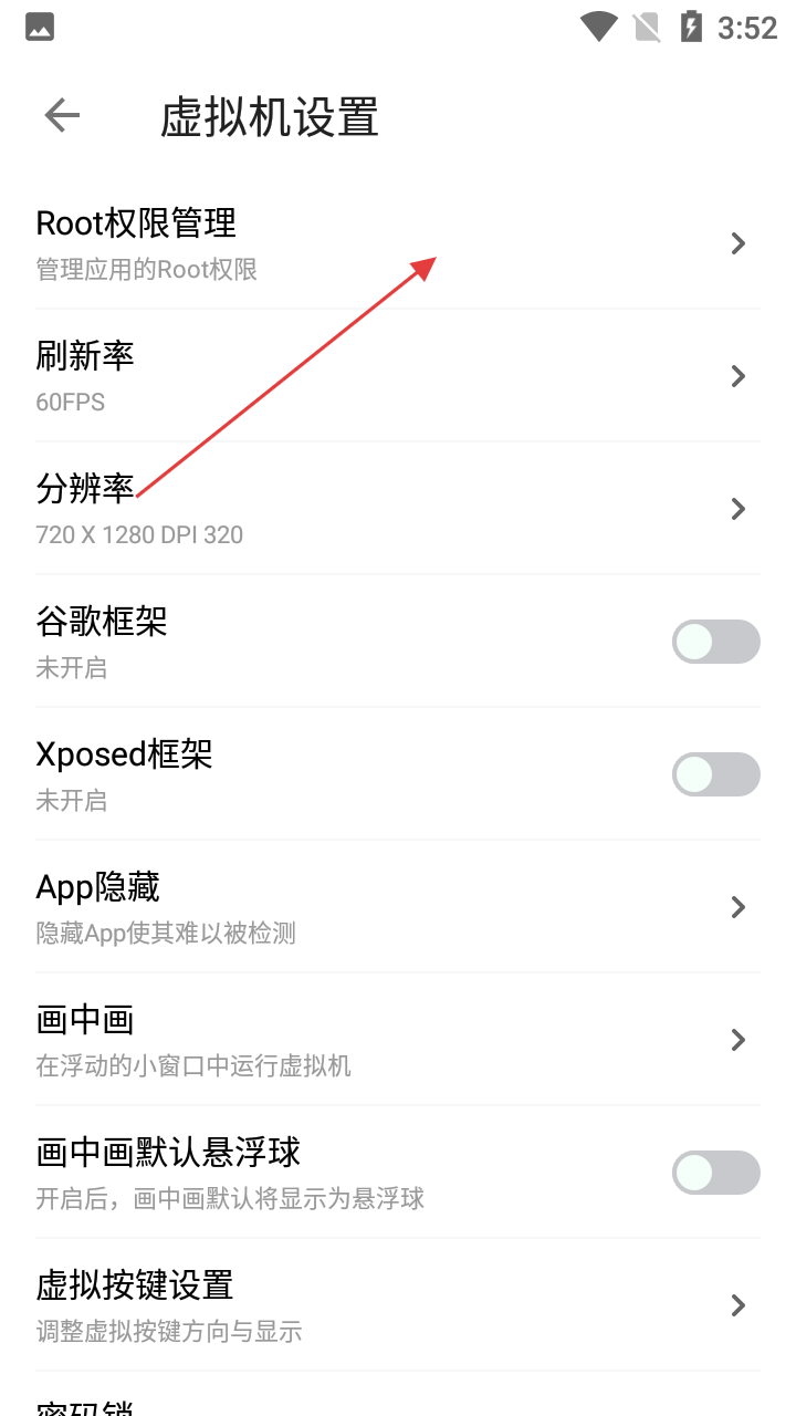 3、在虚拟机设置页面,点击【Root权限管理】选项,可进入Root权限管理页面。
