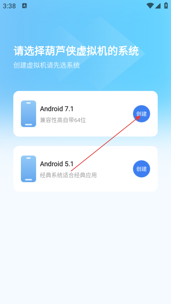 1、在葫芦侠虚拟机系统选择页面,点击【Android7.1】旁的“创建”按钮,可创建该系统的虚拟机。