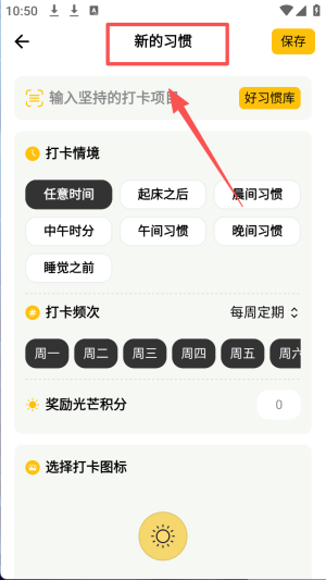 3、在“新的习惯”页面,输入打卡项目,选择打卡情境和频次,保存设置。