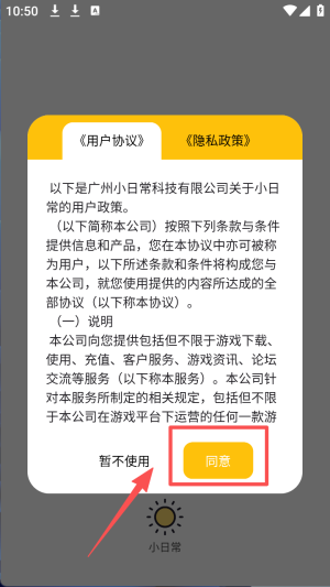 1、点击“同意”按钮,接受用户协议和隐私政策,开始使用应用。