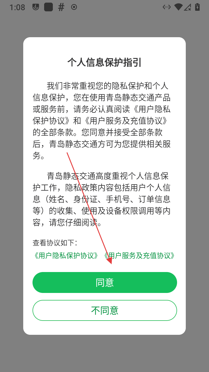 1、打开应用使用前需同意【个人信息保护指引】,点绿色【同意】按钮,接受协议条款。
