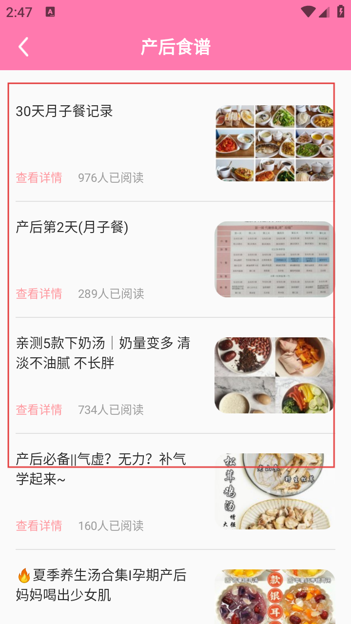 3、进入【产后食谱】页面,能看到“30天月子餐记录”“产后第2天”等具体食谱内容,点击具体食谱。