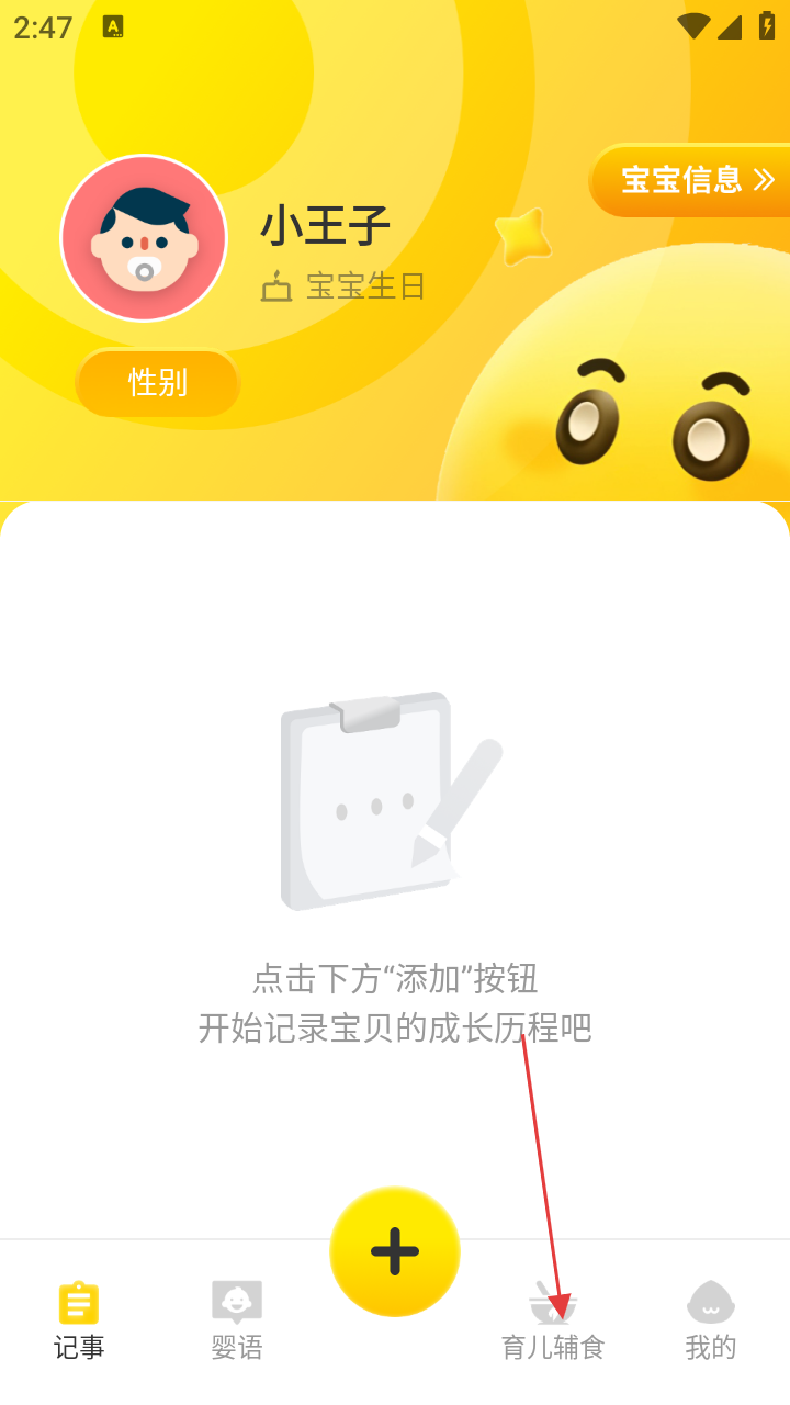 1、打开宝宝辅食日记,可看到宝宝信息展示,点击底部【育儿辅食】。