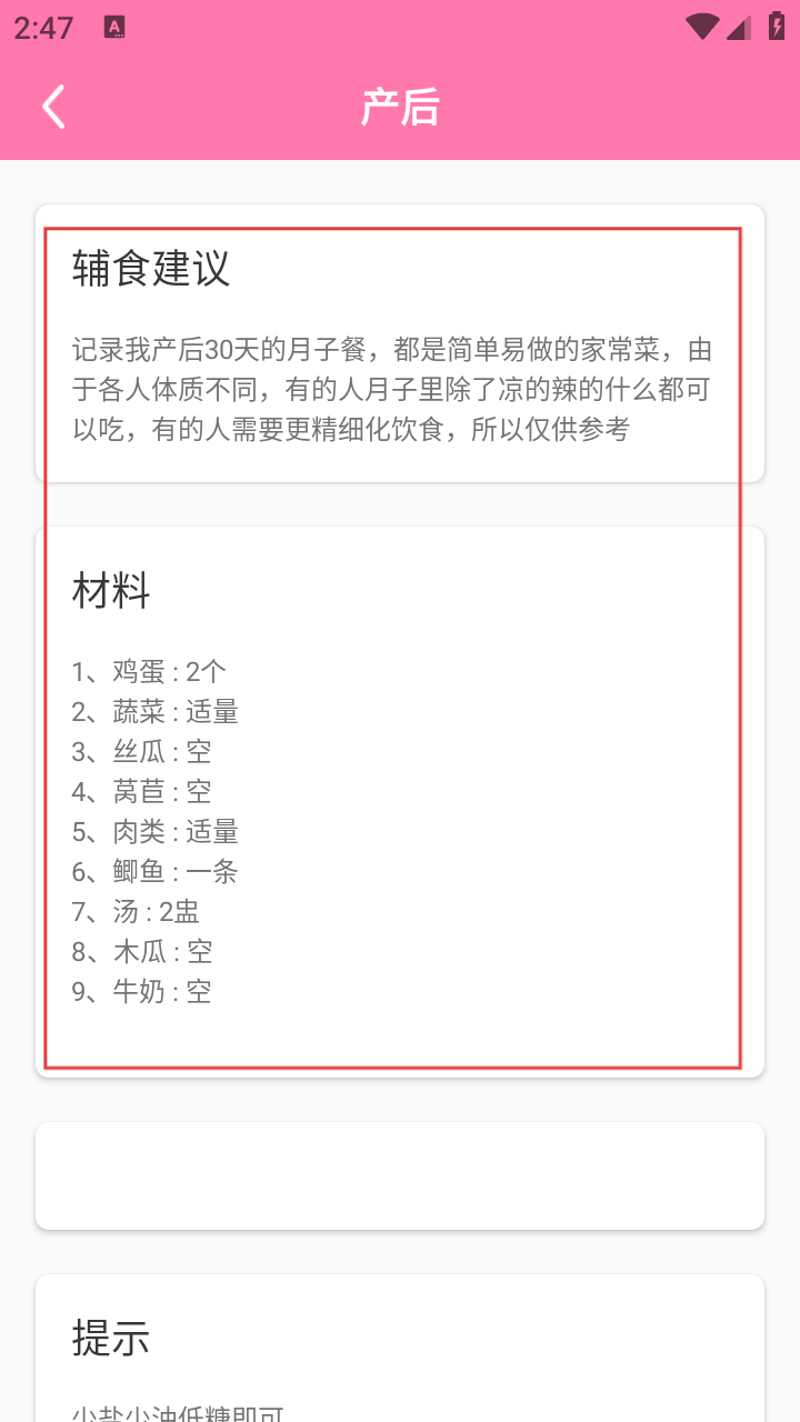 4、进入具体食谱详情页,可查看详细的辅食建议、材料等信息。