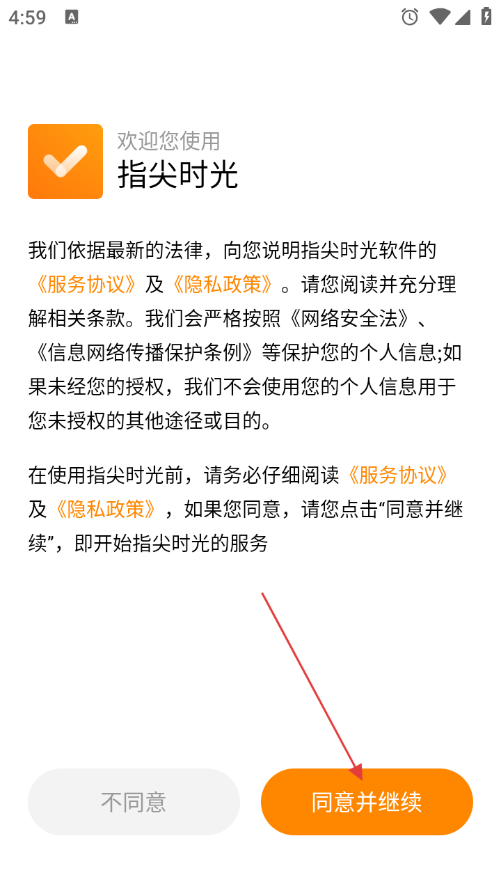 1. 打开指尖时光APP,首先看到服务协议和隐私政策说明页面,仔细阅读后,点击【同意并继续】按钮。