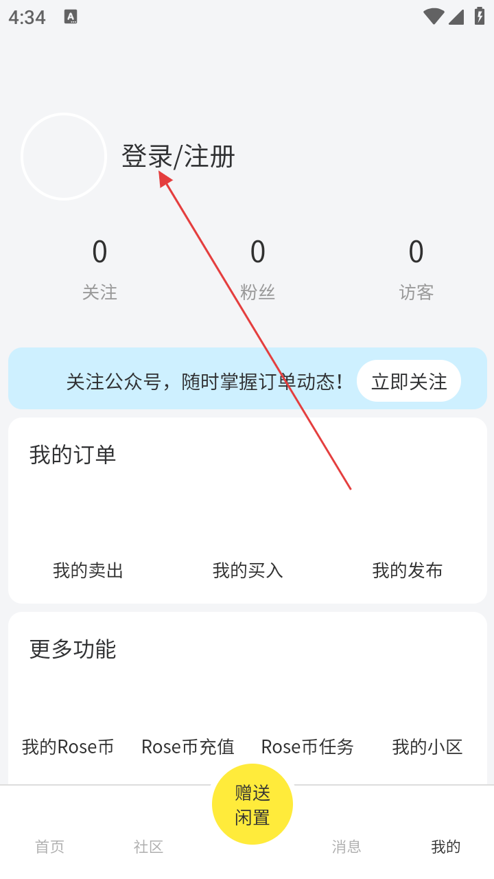 2、在个人界面,找到【登录/注册】入口,准备账号关联。