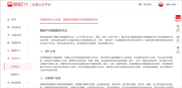1)打开蜻蜓主播后台创收中心,阅读“蜻蜓FM增值服务协议”