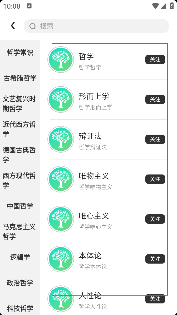 3、选感兴趣哲学分类,如【哲学】【形而上学】等,点【关注】。