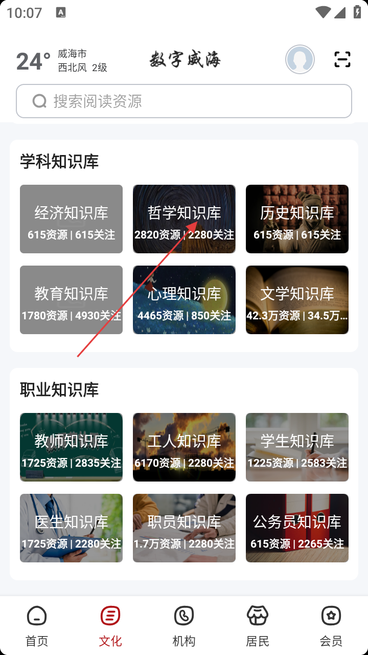 2、在【文化】页选【哲学知识库】,进入哲学知识专区。