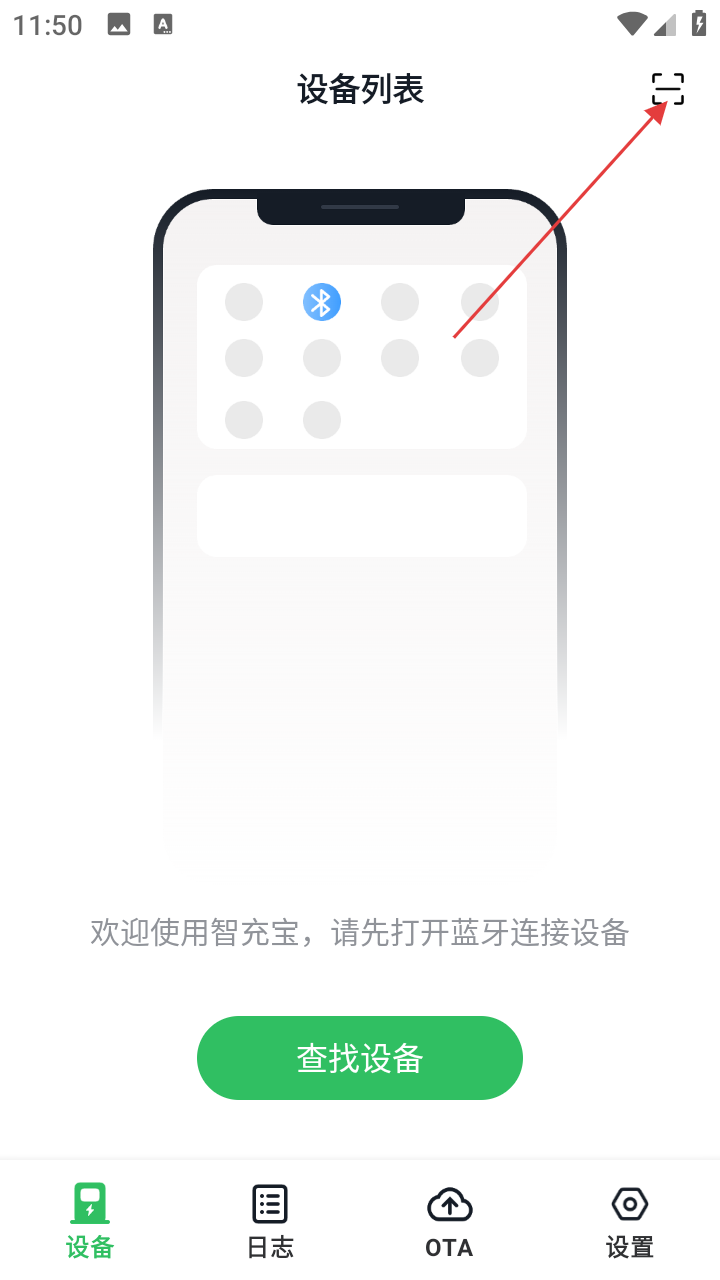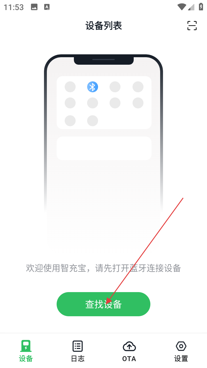 1、打开智充宝APP,在设备列表页点【查找设备】,开启蓝牙搜索。