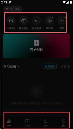 3、选择编辑工具,如一键成片、图文成片等,开始编辑视频。