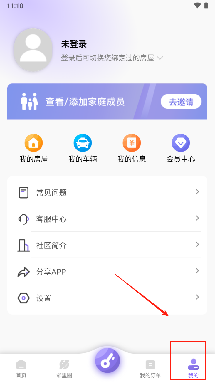 4、点击“我的”图标,查看个人信息,管理房屋和车辆等。