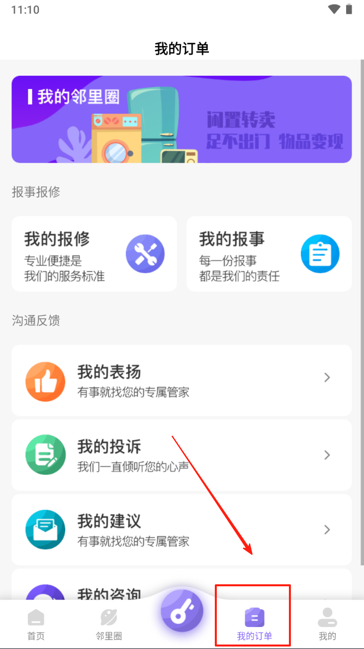3、点击“我的订单”图标,管理您的报修、表扬和投诉订单。