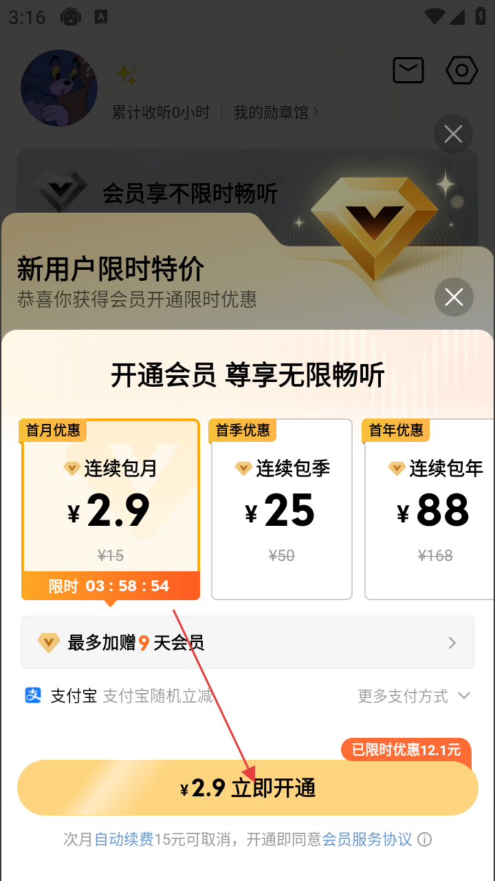 4、可选择连续包季、连续包年等套餐,确认后点击【¥2.9立即开通】按钮完成支付即可开通会员。