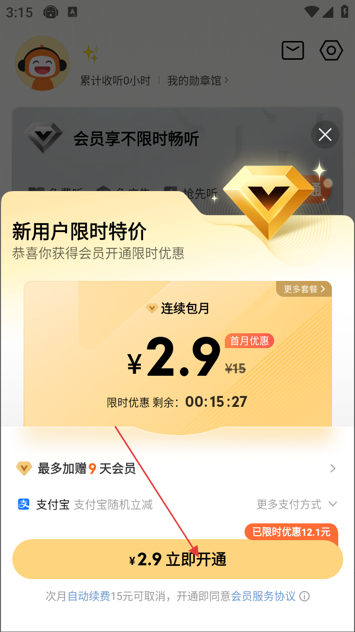 2、进入个人中心后,点击【2.9元开通】按钮,进入会员开通限时优惠页面。