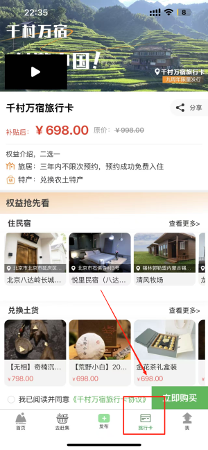 4、在“旅行卡”页面选择“立即购买”,获取千村万宿旅行卡。