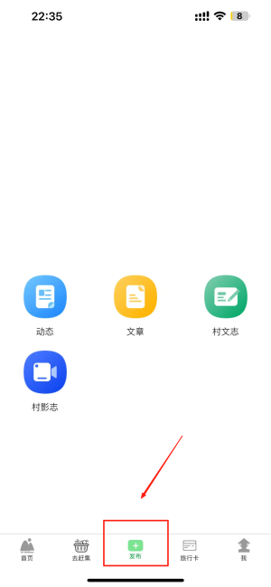 3、在底部导航栏点击“发布”,分享你的乡村旅行体验。