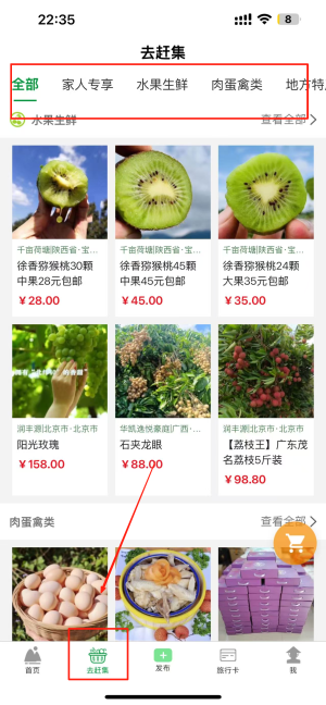 1、在首页选择“去赶集”选项,浏览各类乡村特产。