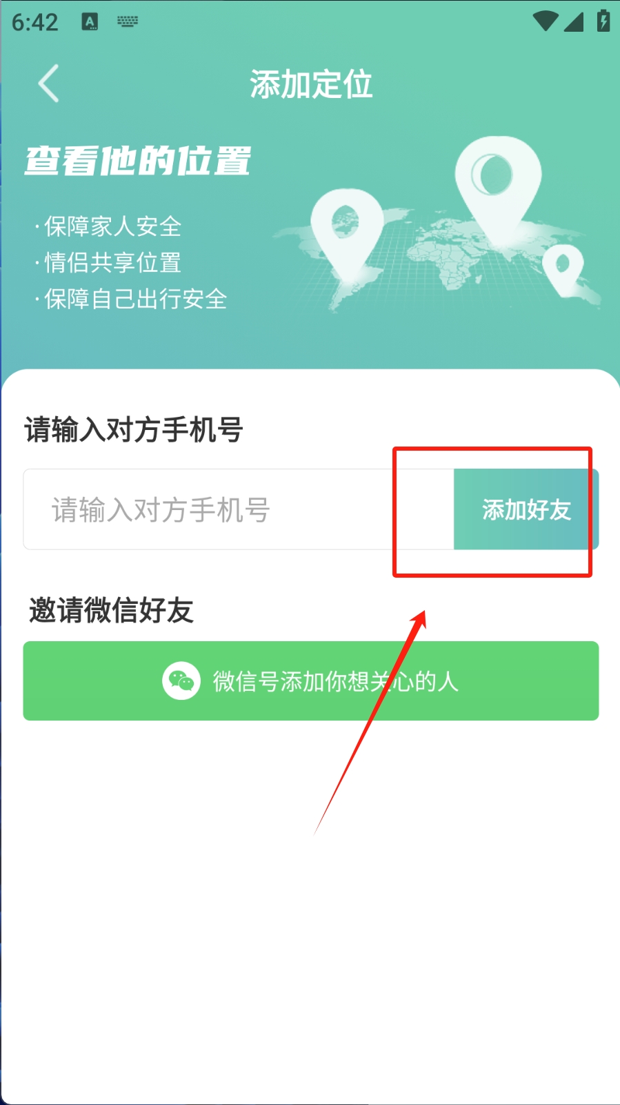 2、在添加定位页面,输入对方手机号并点击“添加好友”按钮,邀请对方分享位置。