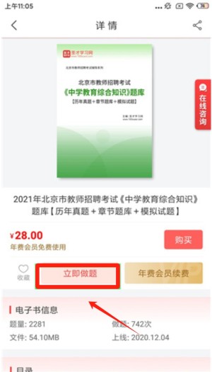 2、选择一本电子书,点击进入详情页,您可以查看电子书的详细信息,包括题量、文件大小和上线时间。