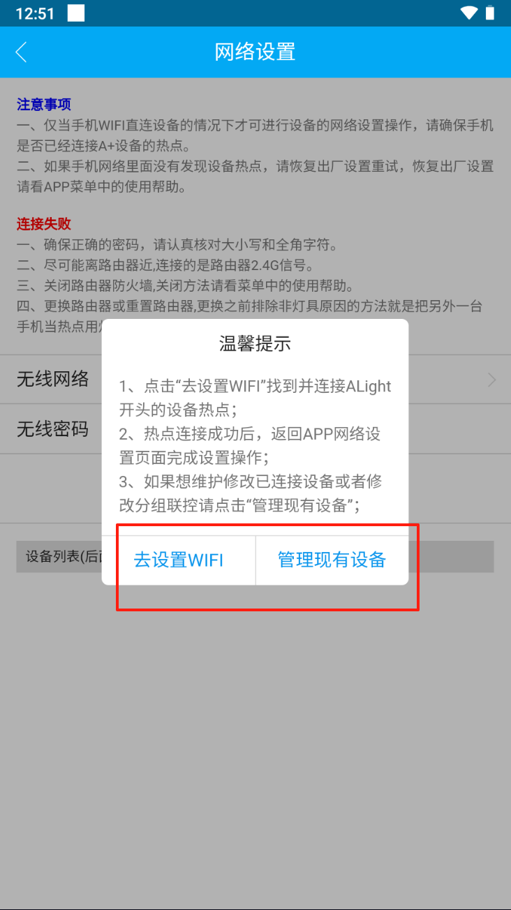 3、配置网络连接:在网络设置页面,点击“去设置WIFI”连接设备热点。