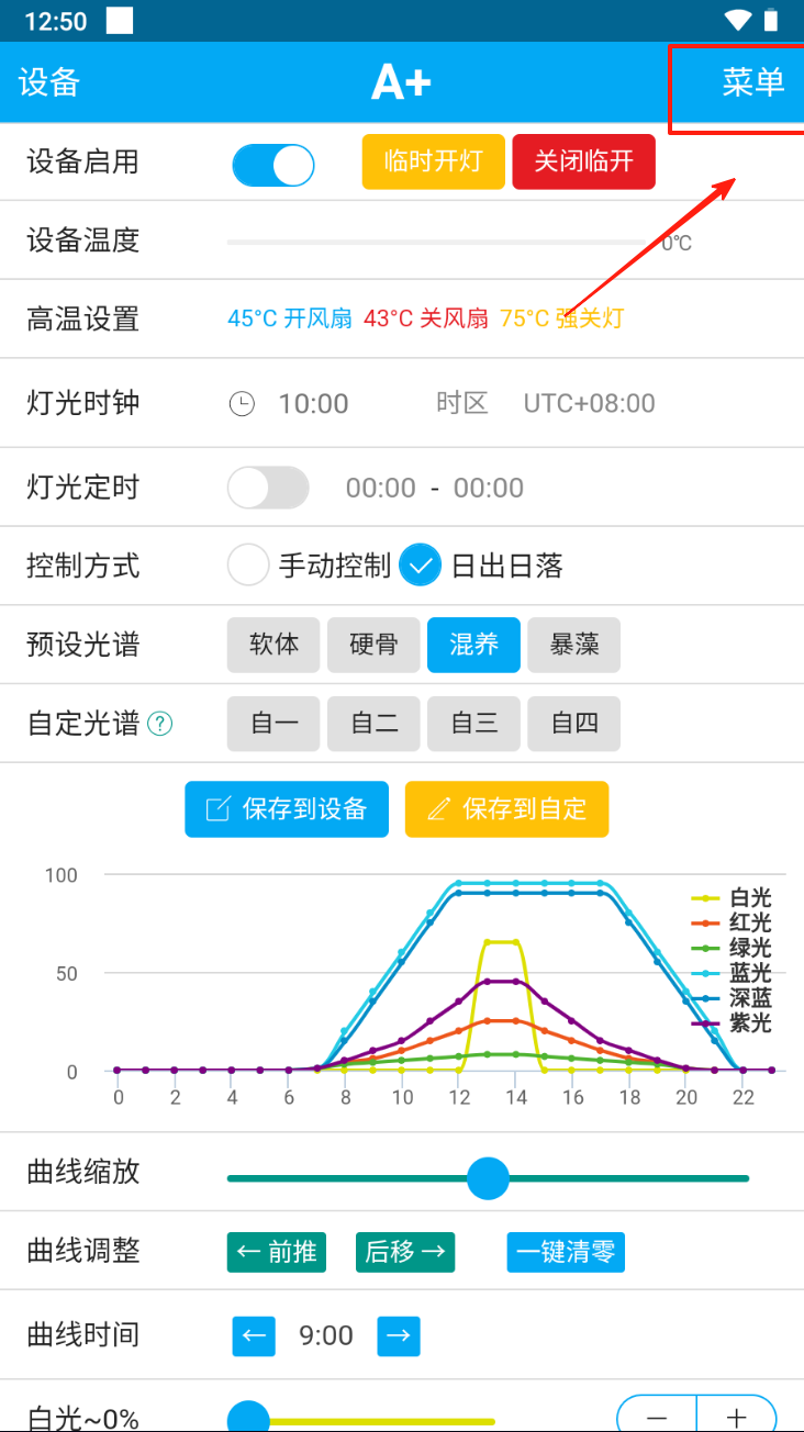 2、设备控制中心可远程调节照明强度、水泵流量、喂食频率等设备参数,支持自定义情景模式一键切换。