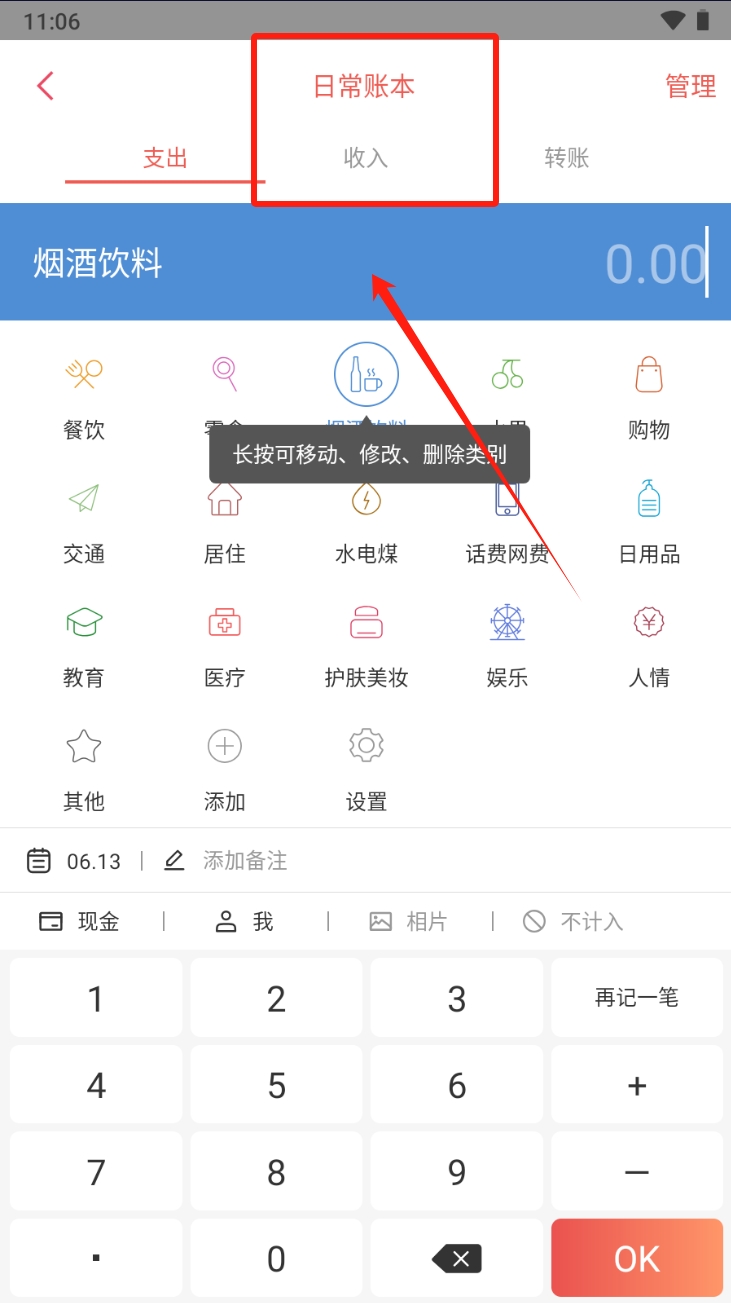 2、在“日常账本”中选择“支出”或“收入”分类来记录交易。