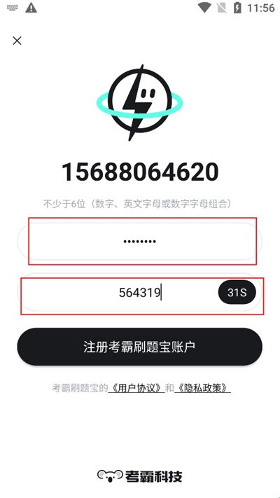 2、设置好自己的登录密码,然后获取验证码,点击注册考霸刷题宝即可成功注册账号啦