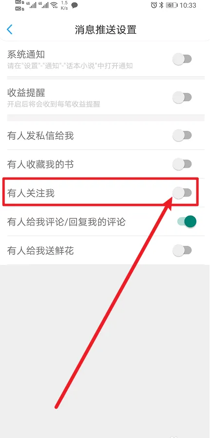 3、进入消息推送设置界面,开启【有人关注我】即可